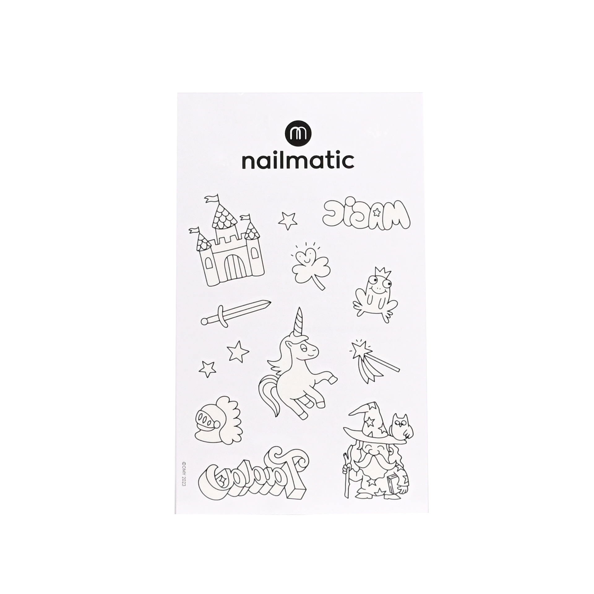 NAILMATIC Une planche de 12 tatouages licorne, château épée … à colorier avec votre Tattoopen. On colorie, on rince et on recommence. Chouette activité d’anniversaire. et si vous n’avez pas de Tattoopen ? pas grave ça fera de jolis tatouages éphémères quand même.
