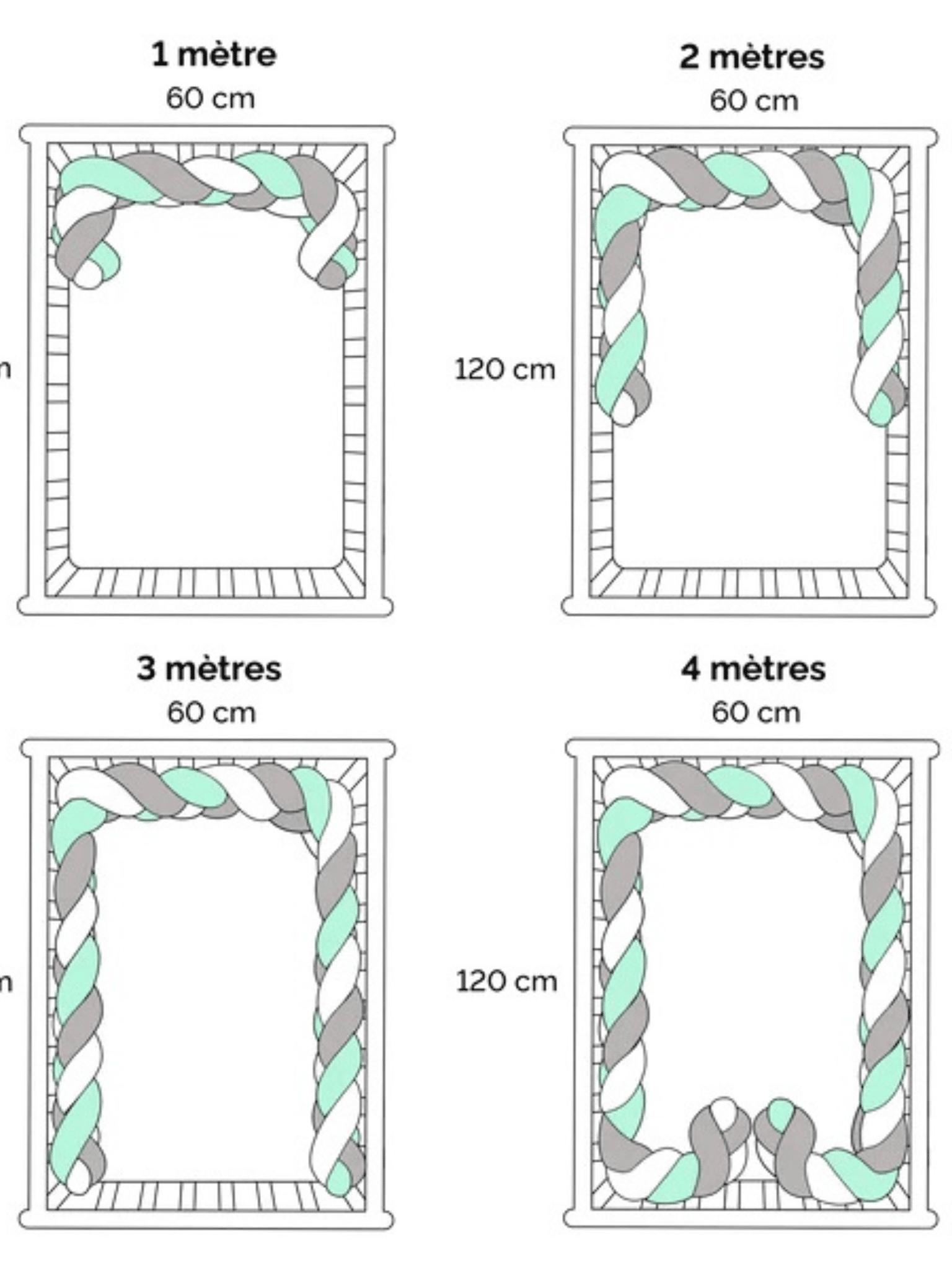 Disponible en 2 à 4 mètres de long, hauteur moyenne 15–20 cm. Une tresse unique, pour un lit 100 % cocooning.