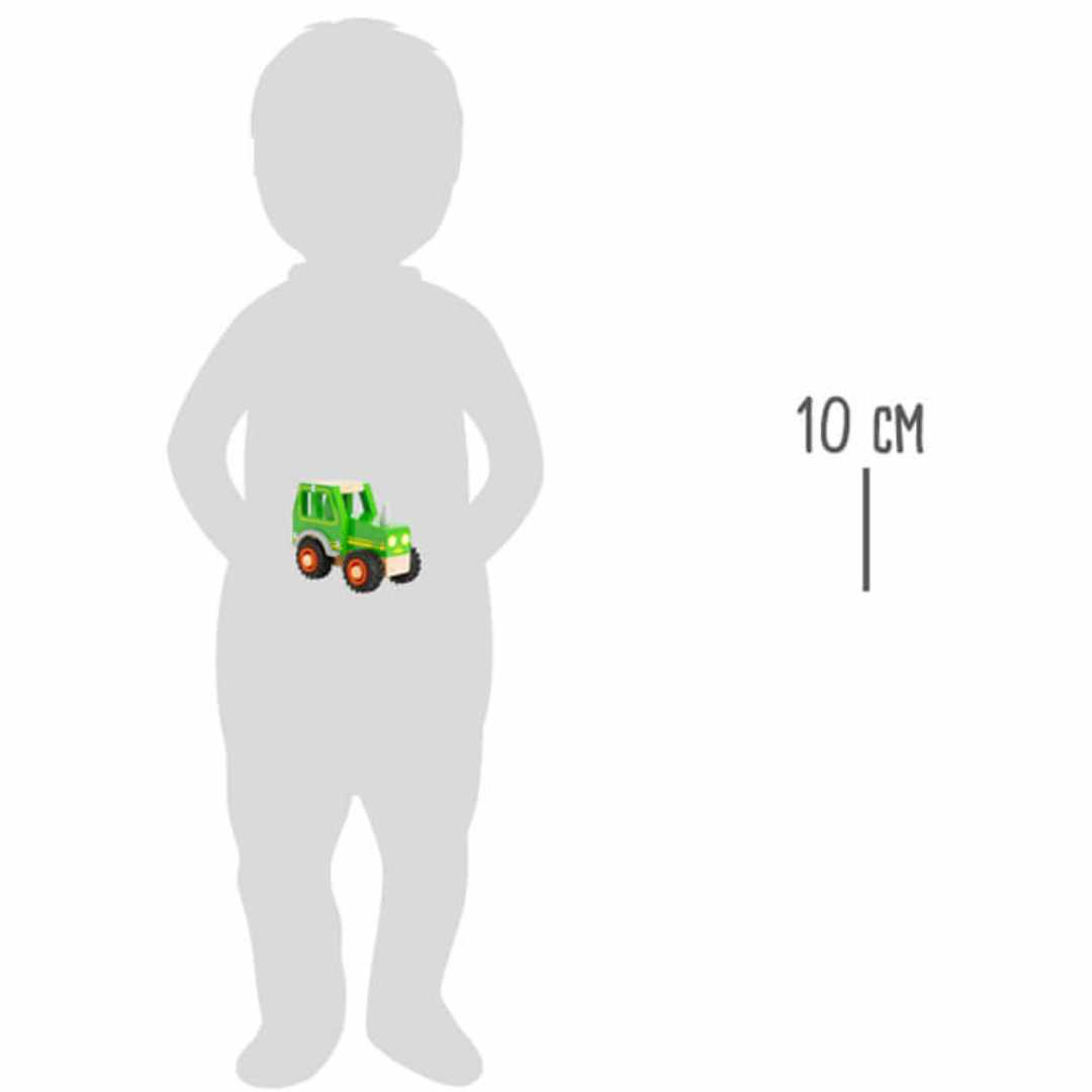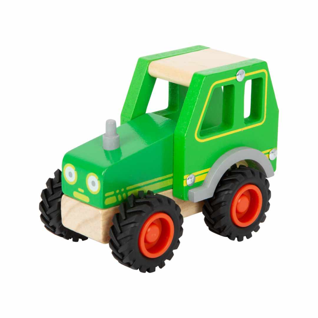Fabriqué en bois robuste, le tracteur roule silencieusement dans les champs avec ses roues en caoutchouc.