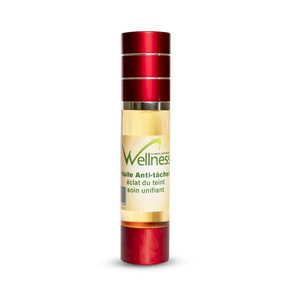 L’huile anti-taches WELLNESS est un soin ciblé aux extraits naturels pour atténuer les taches brunes, cicatrices et irrégularités pigmentaires. Elle nourrit la peau tout en favorisant un teint plus uniforme et lumineux.